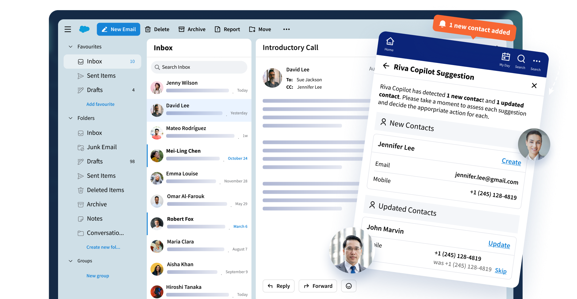 Riva works where you do, connecting Outlook and other core systems to your CRM. That means fewer silos, better data, and stronger collaboration.
