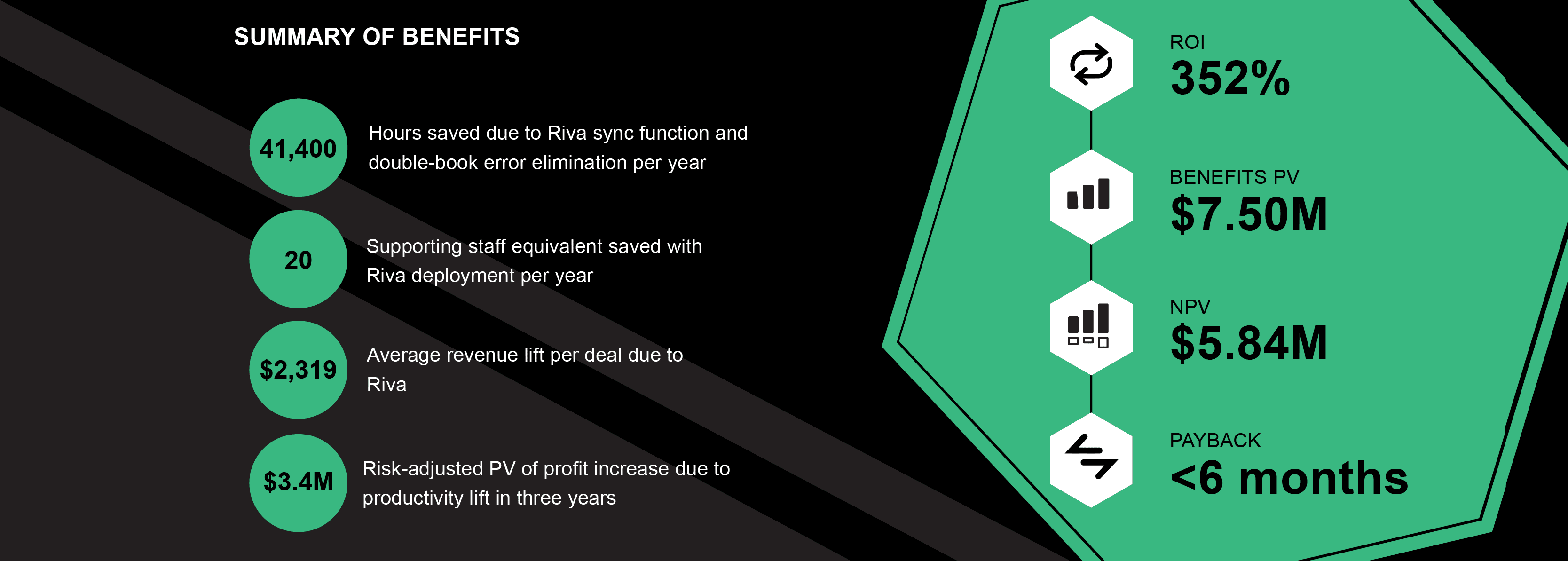 “With a Riva deployment, companies experience time savings, productivity lift, and faster revenue realization.” – The Total Economic Impact™ Of Riva: Cost Savings and Business Benefits Enabled By Riva, A commissioned study conducted by Forrester Consulting on behalf of Riva, February 2023