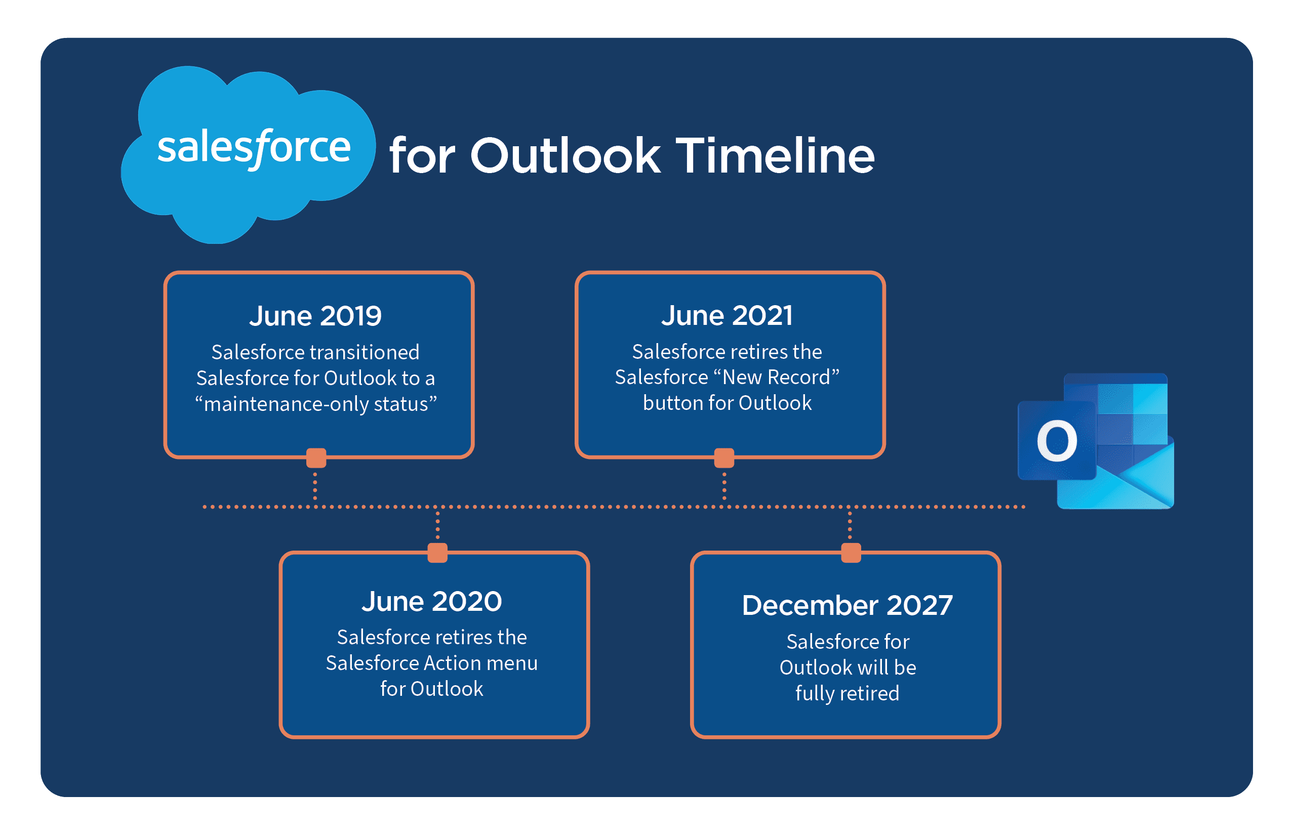 - Salesforce for Outlook is Retiring: Salesforce to Outlook plugin has been helping reps stay productive for a long time. But between June 2021 and December 2027, Salesforce Outlook connector is retiring in a phased approach. Learn about retirement details and your options for Outlook integration with Salesforce after retirement.
