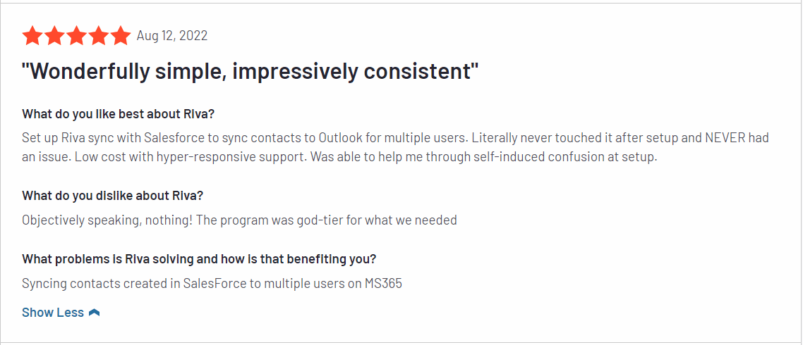 Riva Salesforce Outlook integration is a reliable solution that will help you access Salesforce data right from Outlook, and ensure seamless bi-directional sync. Riva solution has been helping many businesses like yours to save multiple hours’ worth of work, at the same time providing exceptional user experience.