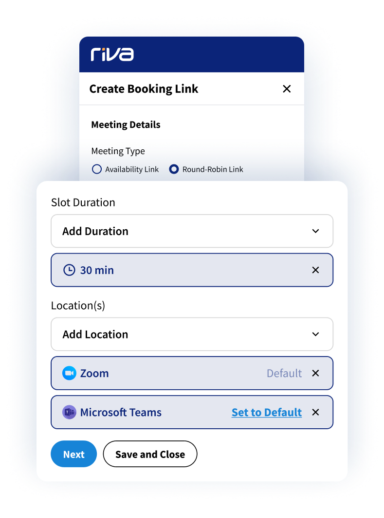 Automatically assign meetings using round-robin logic or book on behalf of teammates. Riva follows your team’s rules so clients meet with the right advisors, every time.