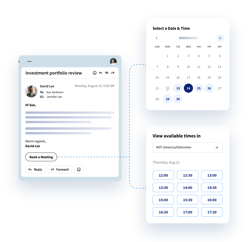 Give clients access to real-time advisor availability so they can quickly book a meeting time that works. Capture their interest right away and focus on having impactful engagements.