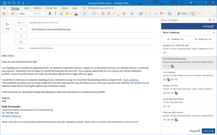 We’ve revamped the Outlook add-in Bookings experience, making it easier for you to cruise through managing your calendar and create availability links directly from Outlook. In addition to being able to access the meeting scheduling features directly from the Insight panel, we are piloting an offer of Riva Bookings for Outlook (conditions apply, contact us for details).