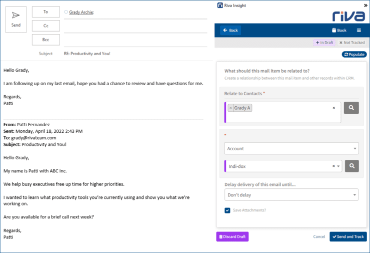 Effective lead management is essential to any successful business. In a typical workflow, leads are not related to an account or opportunity relationship in CRM. With this release, Track in CRM has been updated to make it easier for you to make these associations when tracking an email—contributing to a deeper understanding of your business relationships.