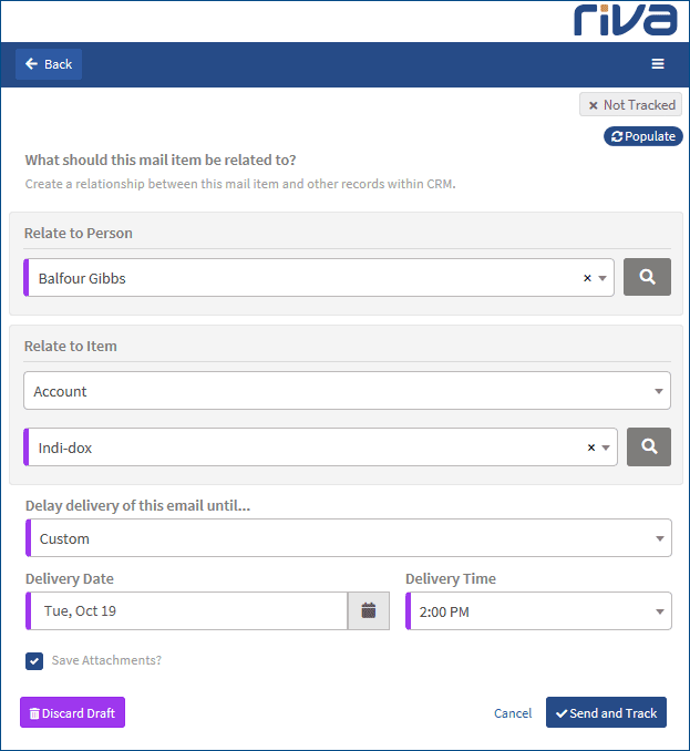 With this release, Riva Insight on Mobile now supports Track in CRM. Now relationship managers can effortlessly track emails right from their mobile while searching for and viewing CRM data from Outlook. Think of the improvements to data quality!