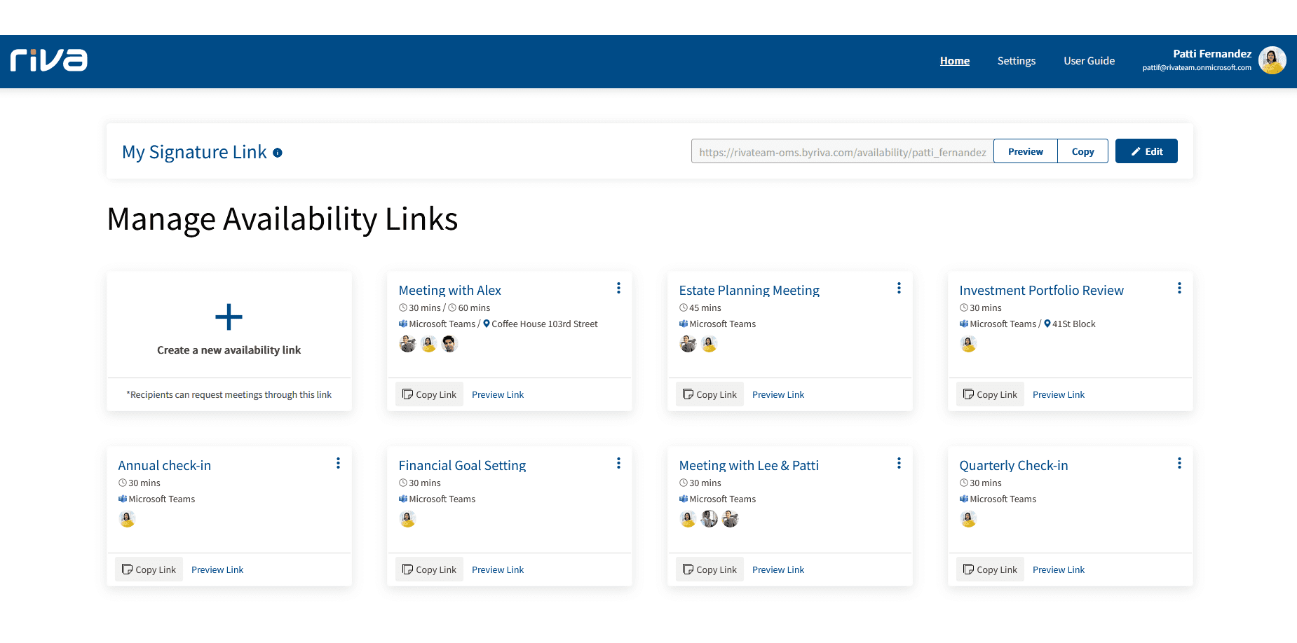 Riva Bookings include a dedicated Signature Link, which can be added to email signatures so that users are accessible for their customers. Signatures booking links does not have additional attendees, can have availability adjusted and functions as one-on-one meetings.