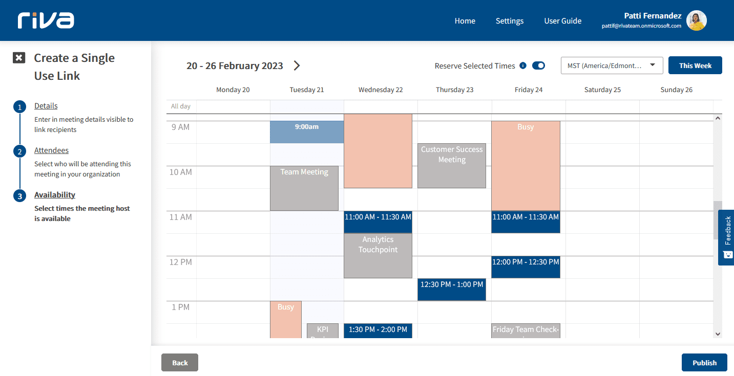 Riva Bookings Single-use links can support multi-stakeholder meeting and provides a unified calendar view to pick the best timeslots that work at all internal required attendees.